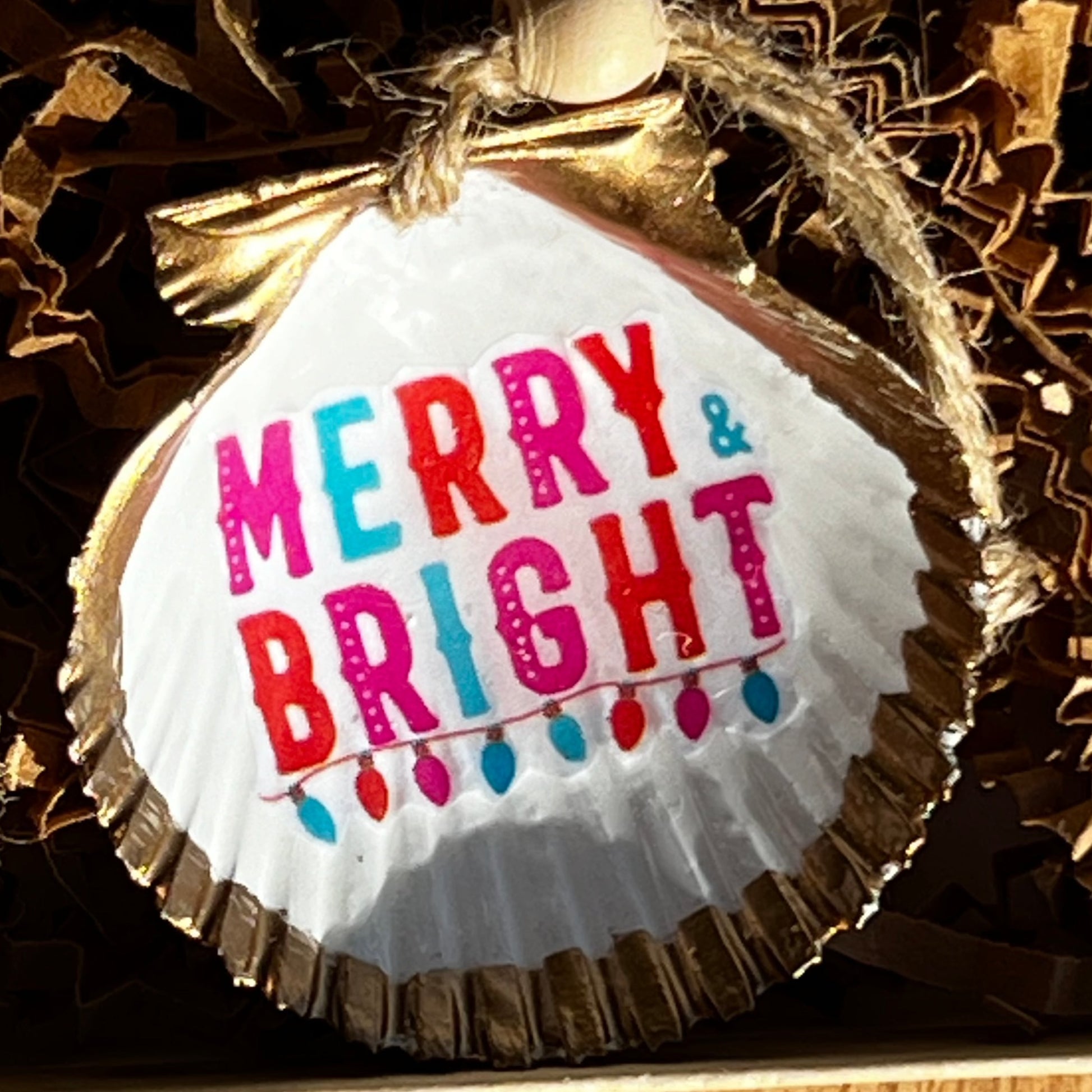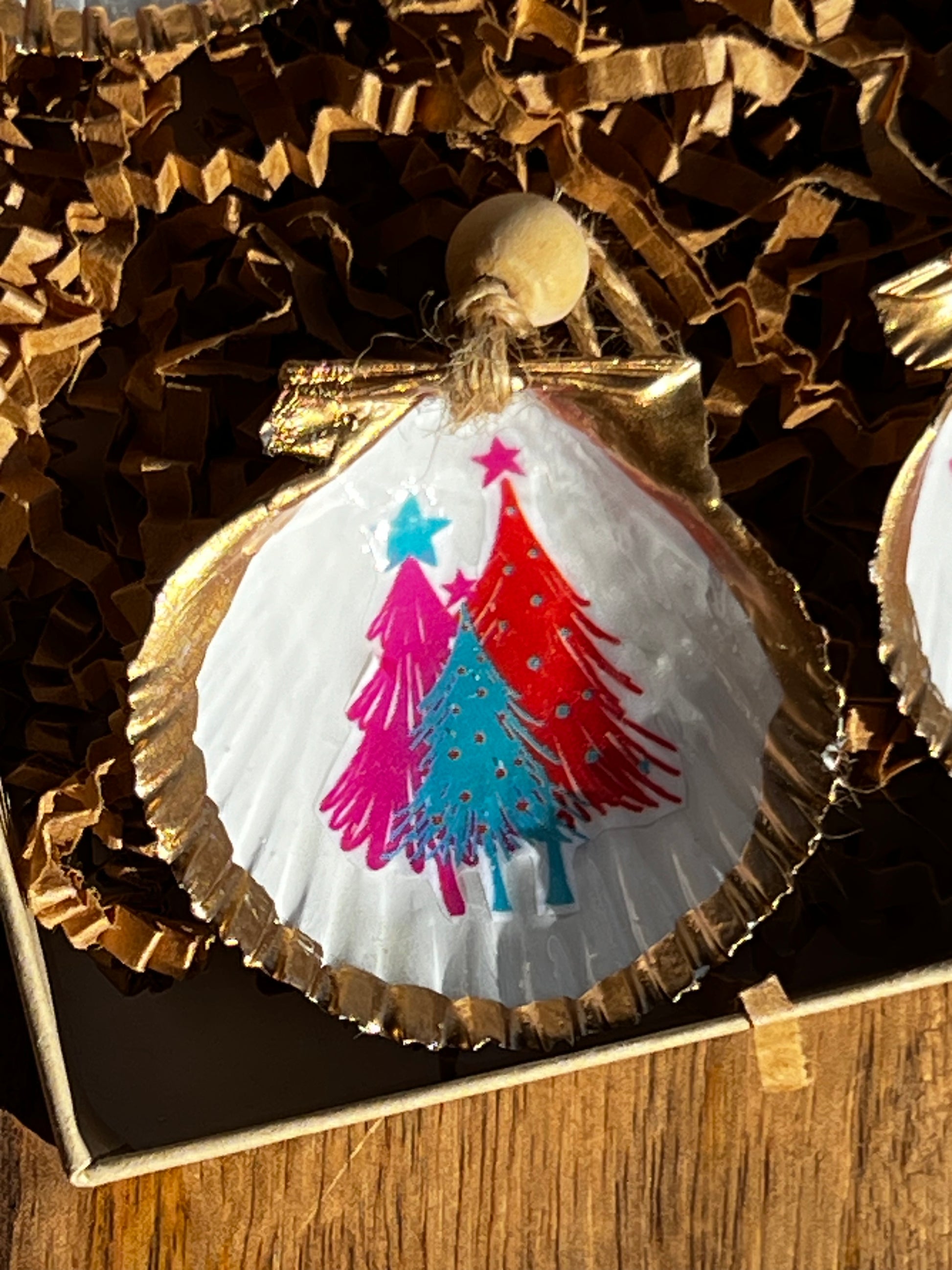Merry & Bright Red, Hot Pink and Teal is perfect for this fun collection! Each shell ornament is a 3"-5" White Irish Deep Scallop Shell. Hung from Jute and topped with a white wood bead. We seal all shells in NON-VOC resin and trim in gold leaf, making them an ornament to last a lifetime.
