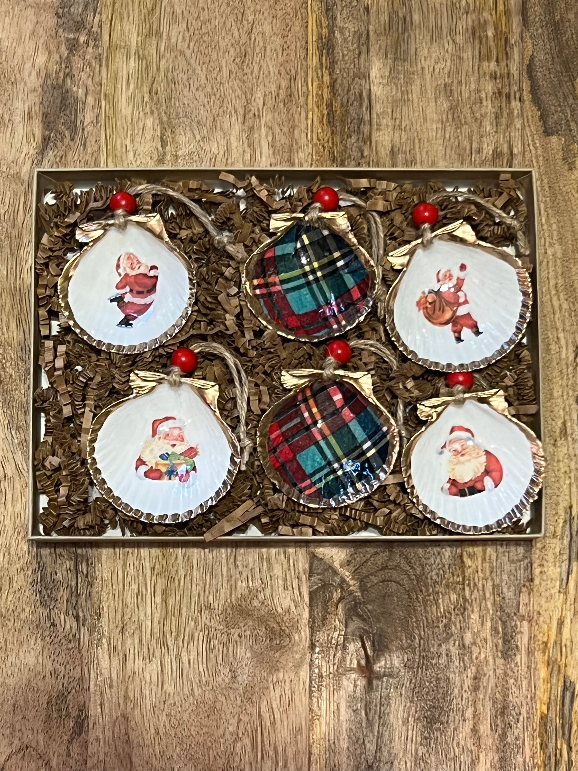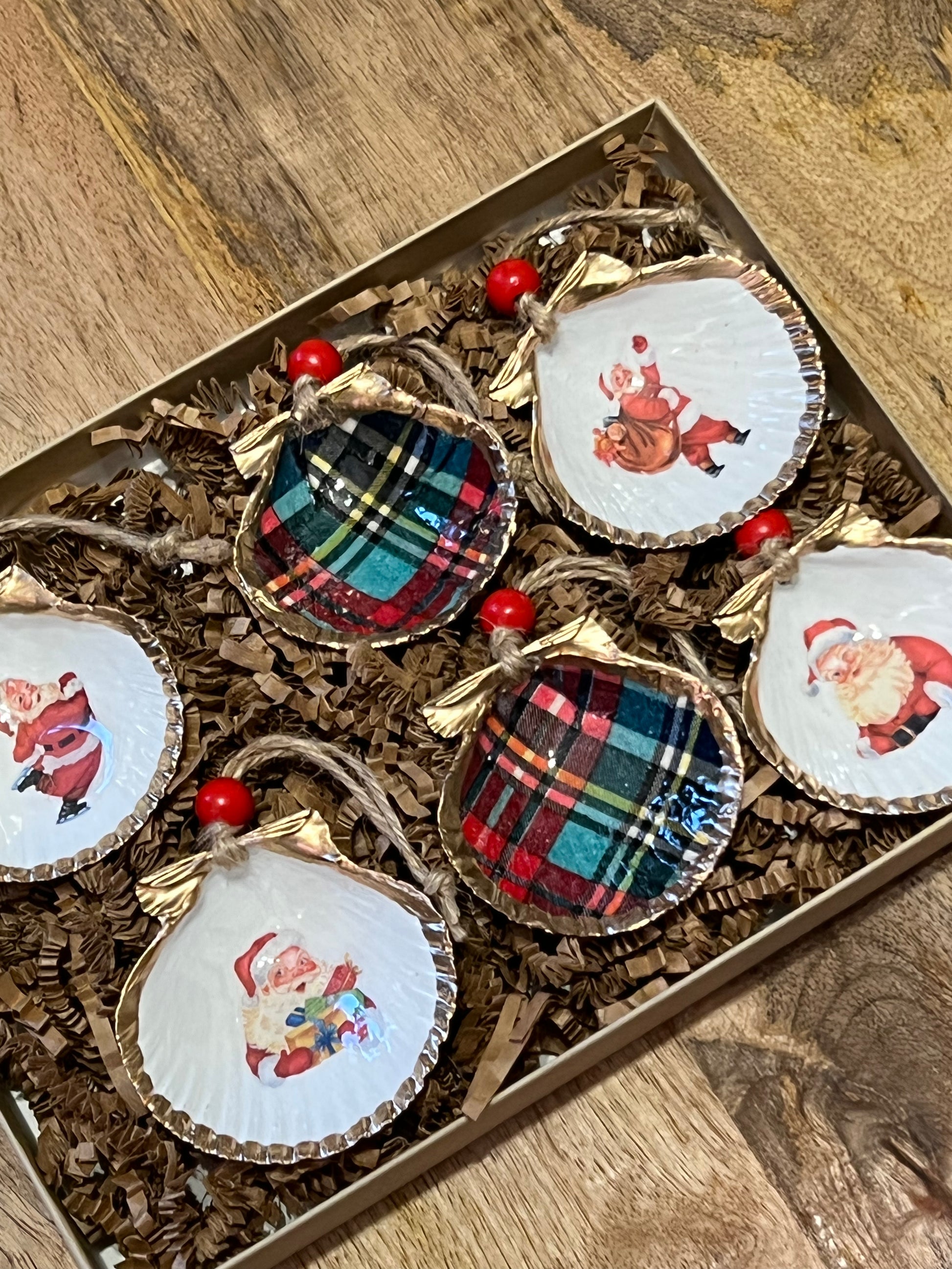 Mini vintage Santa and pretty tartan cover tiny Florida scallop shells. They come in a 6 pack and ready to hang anywhere.