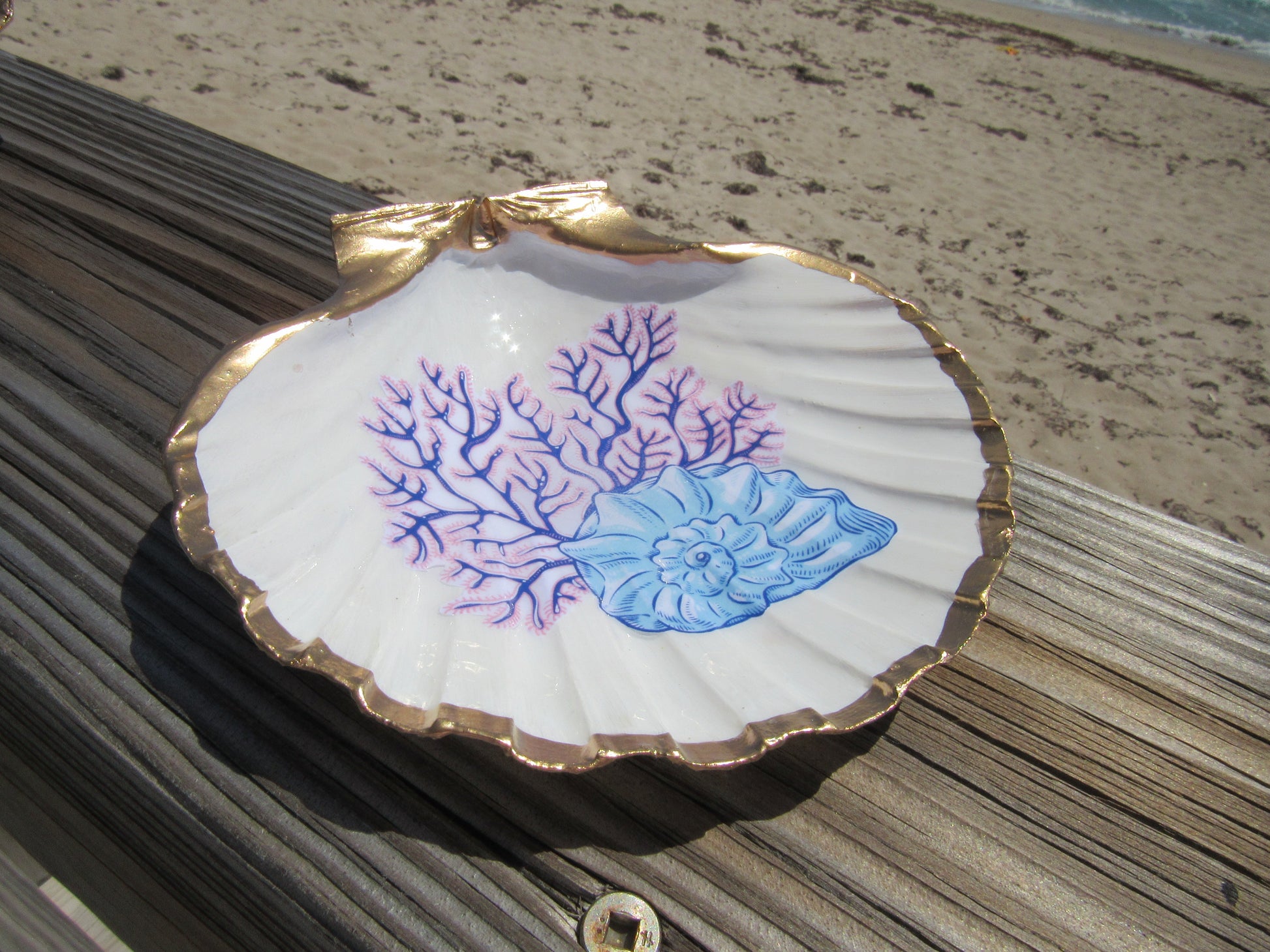 Our South Florida collection is available in our Large, XL, Hanging or Oyster. Each one has a delicate white background and a image for some of our favorite South Florida Towns. They are sealed in resin and trimmed in gold leaf. Each one is different and unique. These XL ones are made with giant Lions Paw shells and 4"-6", Large is an Irish Deep 3"-5". Oysters are 2"-4". Our hanging shells are 3"-4".