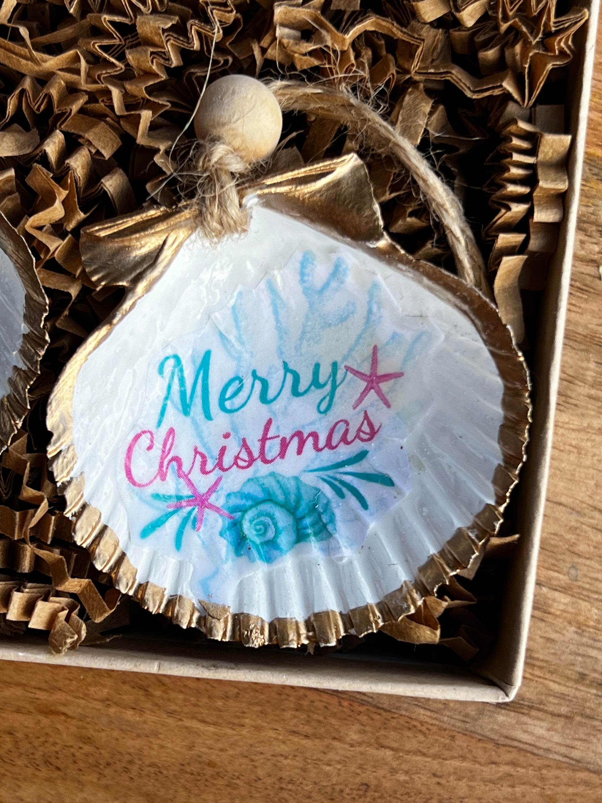 Instead of silver and gold, pink and aqua are the colors for this season! These adorable images and fun colors capture the holiday feeling in a new way. Each shell ornament is a 3"-5" White Irish Deep Scallop Shell. Hung from Jute and topped with a white wood bead. We seal all shells in NON-VOC resin and trim in gold leaf, making them an ornament to last a lifetime.